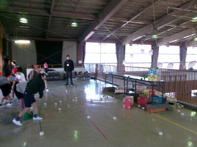 豆(球)を力いっぱい投げて、みんなで退治しました。