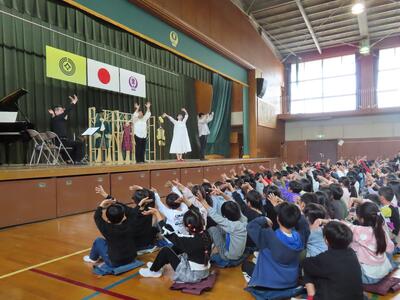 1~3年生は、リズムにのって体を動かしたり、演奏者の方々とかけ合いをしたりしながら鑑賞し、笑顔あふれる演奏会となりました。オペラの終盤では、子供たちから手拍子が自然と湧き上がり、演奏者の方々も喜ばれていました。